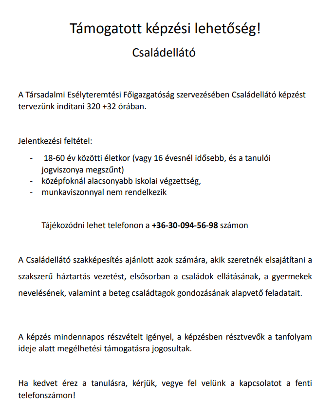 2023. február 16-án, csütörtökön 9 órától családellátó képesítéssel kapcsolatos tájékoztatót tartottak a Zombai Művelődési Ház Ifjúsági terében.